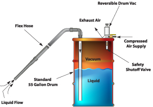 Electrically operated "all purpose" vacuums aren't designed for use in industrial environments. As a result, motors wear out quickly and impellers clog. The Reversible Drum Vac does not use electricity and has no moving parts, assuring maintenance free operation. An automatic safety shutoff valve prevents spills or overfilling.