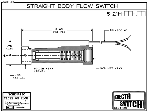 ES5-21H Straight Body High Flow Switch The ES5-21 high flow switch is available in 0.30 or 0.75 GPM preset trip point; low pressure drop at/or near threshold operate point; comparatively low pressure drop at high flow rate; accessory thread adapters are not required. |