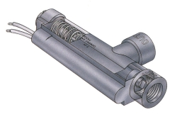 The 5-19 angle body flow switch / flow indicator is available in preset trip points including 0.1 gpm , 0.25 gpm, 0.50 gpm, 0.75 gpm, and 1.00 gpm. (Requires Series 5 accessory fittings). A red color rod is visible through a transparent window and provides relative indication of flow rate. |